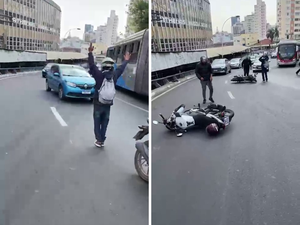 Incidente no Viaduto Cury: motociclistas derrapam devido a vazamento de ônibus BRT 20 – Emdec atua rapidamente para conter óleo na pista