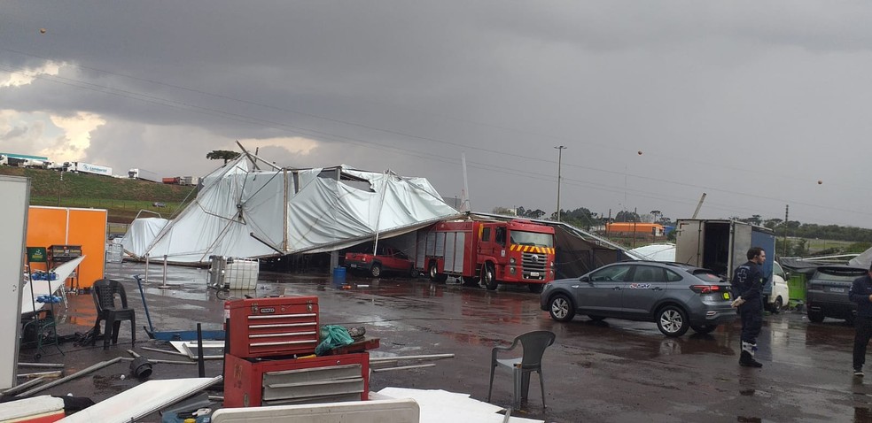 Temporal no Autódromo de Cascavel derruba estrutura durante evento de corrida. Rajada de vento atinge 71 km/h, causando danos, mas sem feridos. Ajuda disponível.