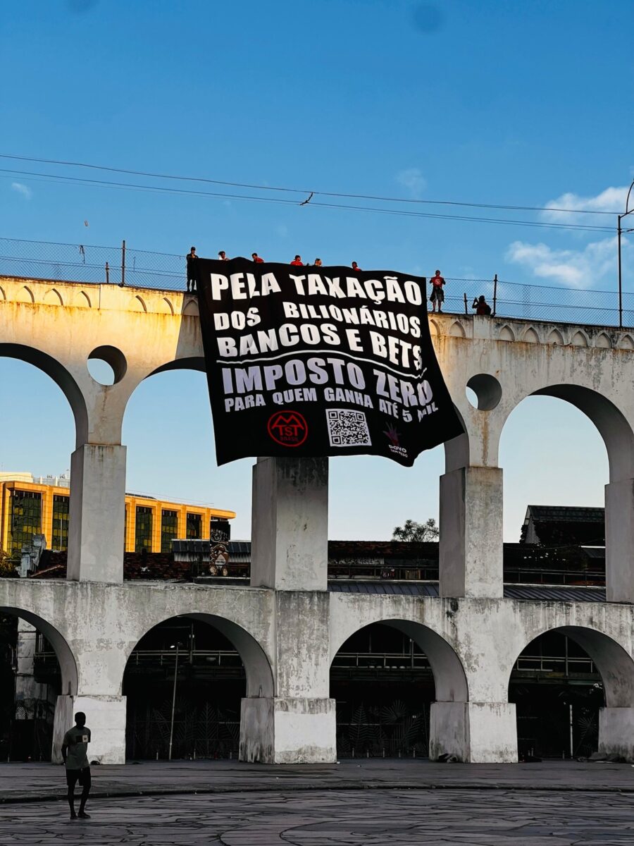 MTST estende bandeirão nos Arcos da Lapa em protesto por taxação dos bilionários