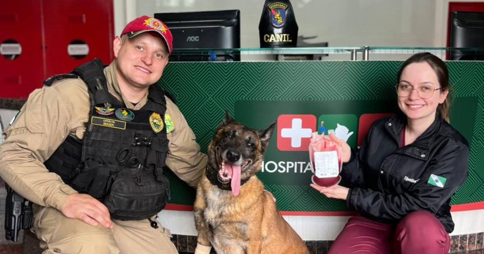 Cão policial Átila doa sangue para salvar cadela atropelada em Cascavel, Paraná. Saiba como seu pet pode ser um doador e salvar vidas também.