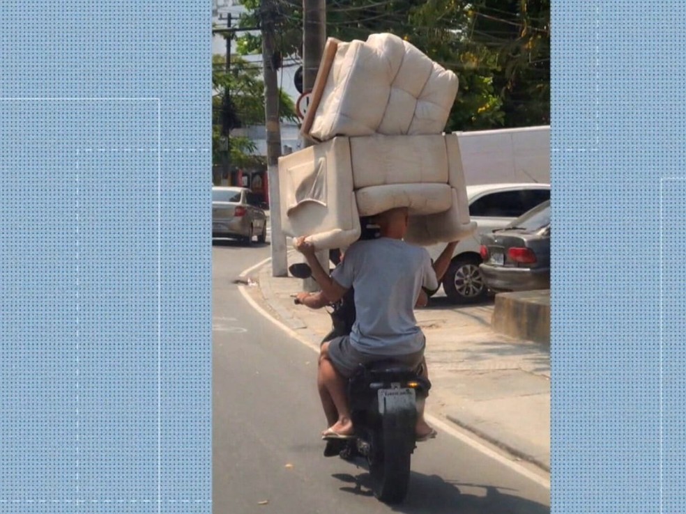 Vídeo mostra poltrona sendo transportada na moto na Ilha do Governador: alerta para segurança no trânsito