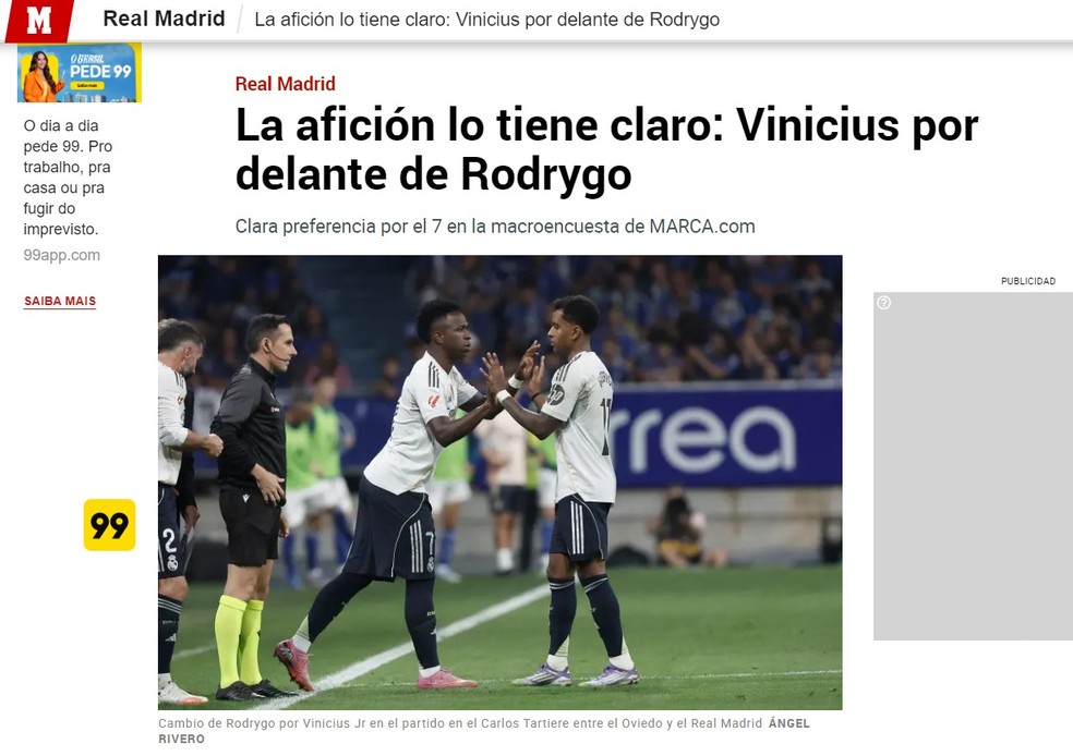 Votação em jornal espanhol aponta Vini Jr. como titular do Real Madrid na ponta esquerda, com cinco gols e quatro assistências. Rodrygo fica atrás na preferência dos torcedores.