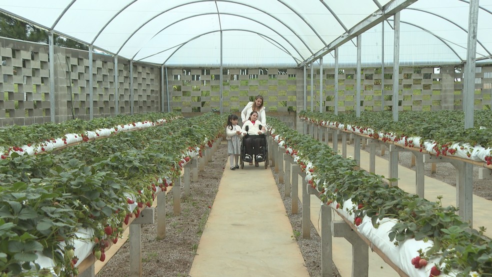 Colhe-e-pague de morangos na RMC oferece espaço acessível para pessoas com mobilidade reduzida. Projeto inclui loja de produtos coloniais e cafeteria. Saiba mais!