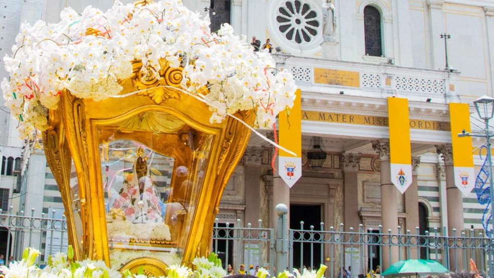 Visite a Imagem Peregrina de Nossa Senhora de Nazaré na praça Santuário em Belém. Momento de devoção e gratidão aos fiéis durante o Círio de Nazaré.