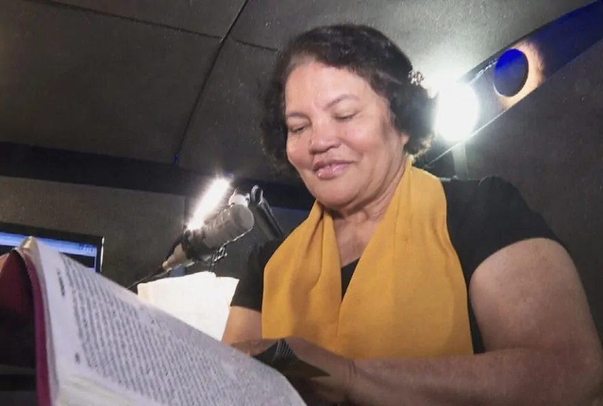 Léia Pereira da Silva lê um trecho da Bíblia, em Goiás, emocionando-se com a