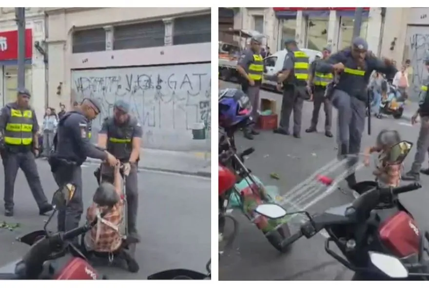 A idosa, então, arremessa o carrinho em direção ao policial, que revida chutando