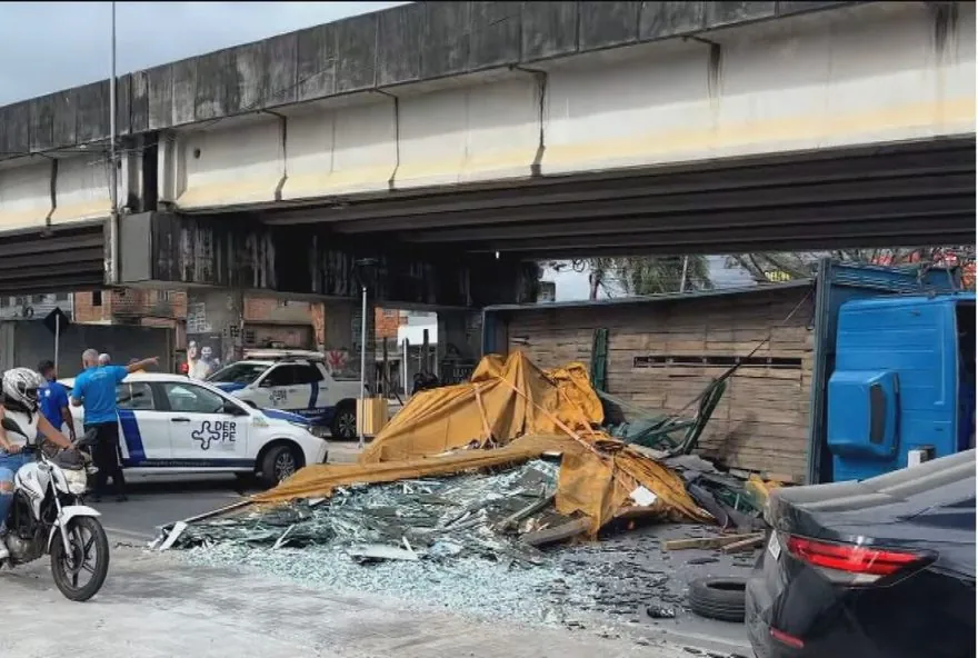 Caminhão com carga de vidro e espelhos tombou na PE-15, em Olinda; VÍDEO