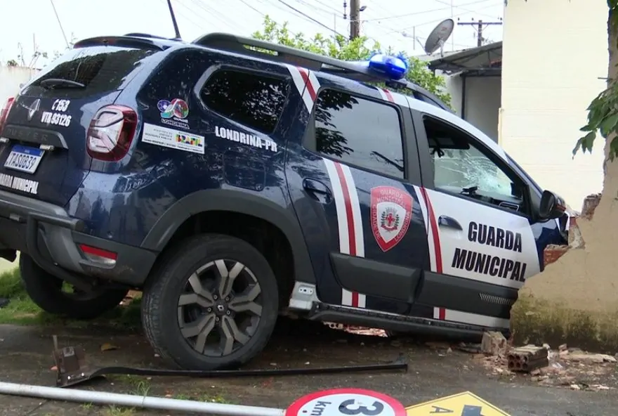 Uma viatura da Guarda Municipal (GM) de Londrina, no norte do Paraná, quebrou o muro de uma casa ao se envolver em um acidente com outro carro. Nesta terça-feira (4), uma equipe estava a caminho da Escola Municipal da Vila Brasil e, ao passar pelo cruzamento entre as ruas Uruguai e Paes Leme, bateu contra um veículo que avançou a preferencial. As informações foram divulgadas pela Prefeitura por meio de nota. Com o impacto, o condutor perdeu o controle da viatura e atingiu o muro de uma casa.