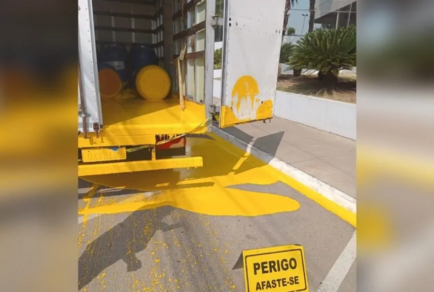 Veículos e até um motociclista que passava pelo trecho ficaram sujos de tinta. Empresa responsável pelo caminhão foi comunicada e vai enviar uma equipe para realizar a limpeza e a contenção do produto.