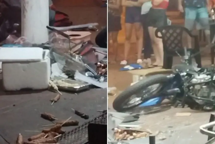 Devido ao impacto, o motociclista caiu e a moto deslizou no asfalto até atingir a churrasqueira instalada na calçada do bar.