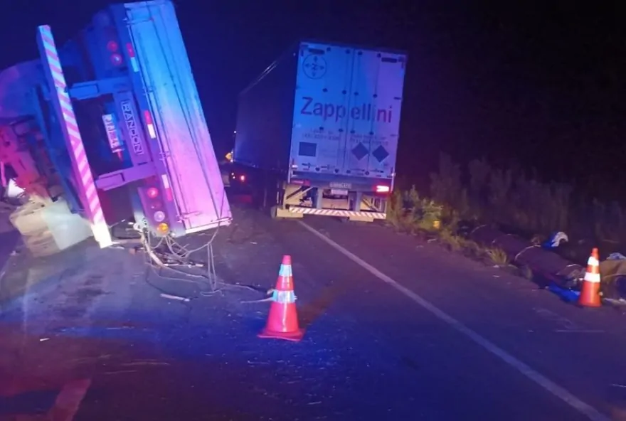 O acidente aconteceu na noite de terça (21), às 20h30, e envolveu um caminhão-cegonha de Maringá que transportava seis veículos e uma carreta de Votuporanga (SP) carregada com estruturas metálicas.