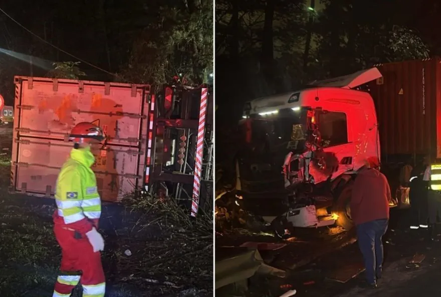 Um trágico acidente resultou na morte de um caminhoneiro na madrugada deste domingo (31) na Rodovia Cônego Domênico Rangoni, em Cubatão (SP). O motorista foi lançado para fora da cabine do caminhão após colidir na traseira de uma carreta e acabou sendo esmagado pela própria cabine, que tombou no canteiro lateral da rodovia. A cena chocante foi registrada após a colisão, evidenciando a gravidade do acidente.