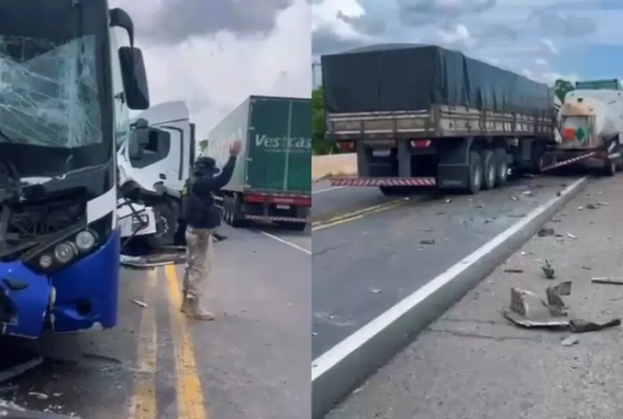 Um grave acidente envolvendo um ônibus, um caminhão e duas carretas resultou em oito feridos na BR-116, em Brejo Santo, no Ceará, na última quarta-feira (28). O motorista do ônibus, de 26 anos, sofreu ferimentos graves nas pernas e foi levado a um hospital de Brejo Santo para receber cuidados médicos. Dentre os feridos, sete pessoas da mesma família estavam a bordo do ônibus que transportava romeiros entre Alagoas e Ceará.