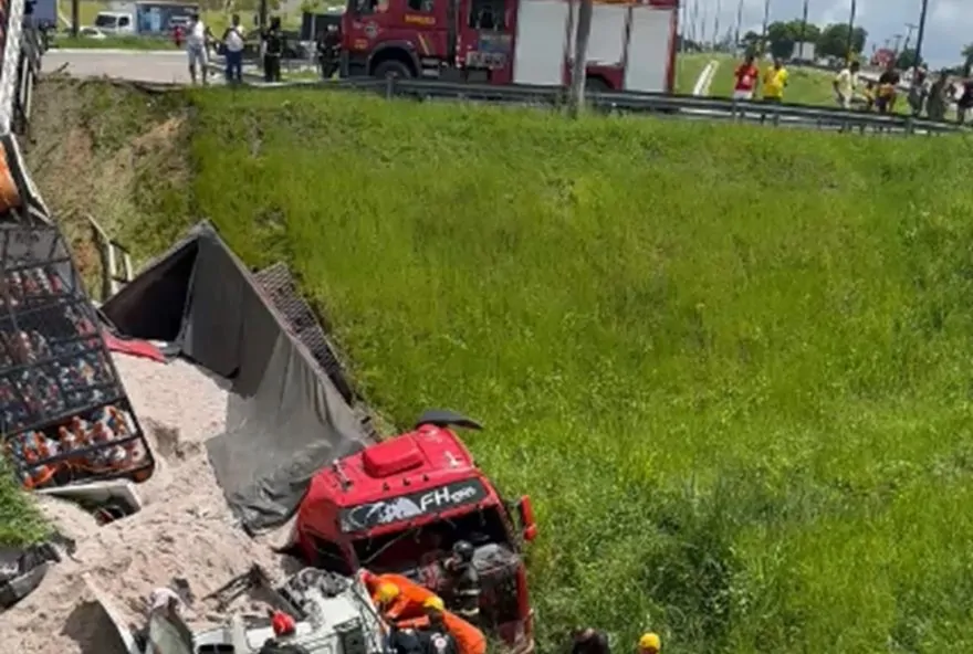 Acidente grave na BR-101 em Igarassu: caminhão e carreta caem em ribanceira após colisão, deixando um dos motoristas preso às ferragens. O ocorrido aconteceu no quilômetro 39,5 da rodovia, próximo a um retorno, e mobilizou equipes de resgate. O motorista que ficou preso foi socorrido por helicóptero e levado para um hospital da região.