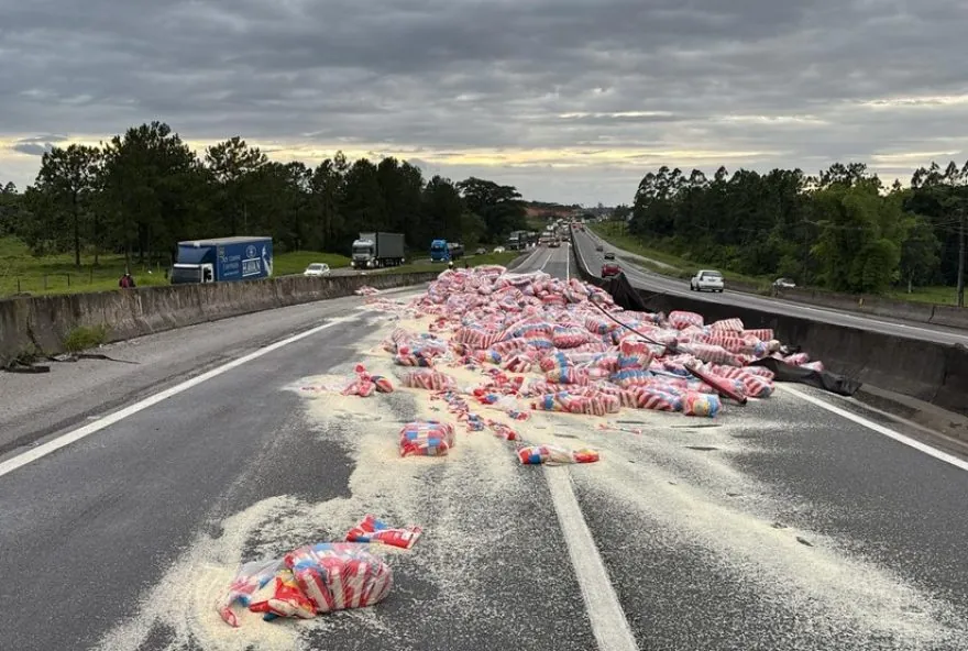 Carga com sacos de arroz tomba sobre as duas faixas da BR-101 em SC e bloqueia rodovia