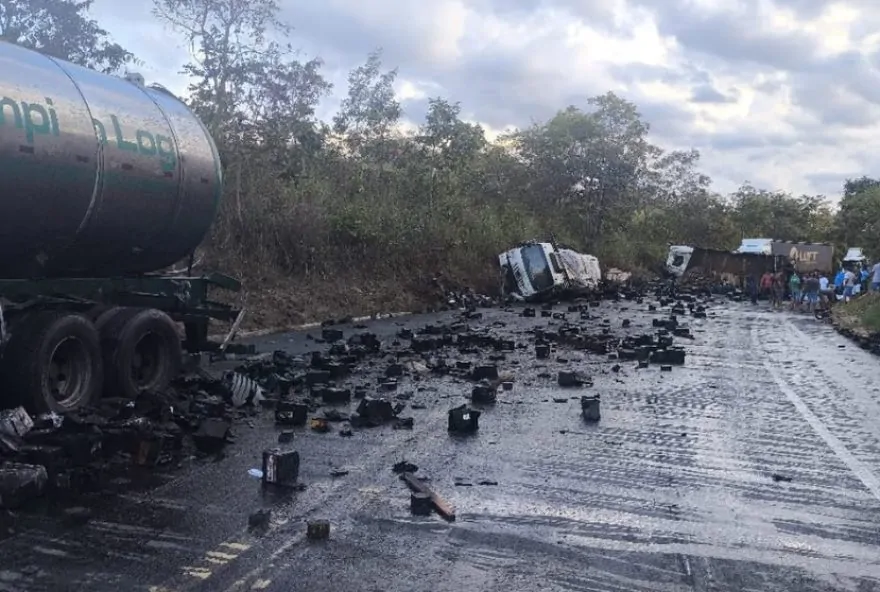 carga de bateria automotiva, que era transportada pela carreta, ficou espalhada