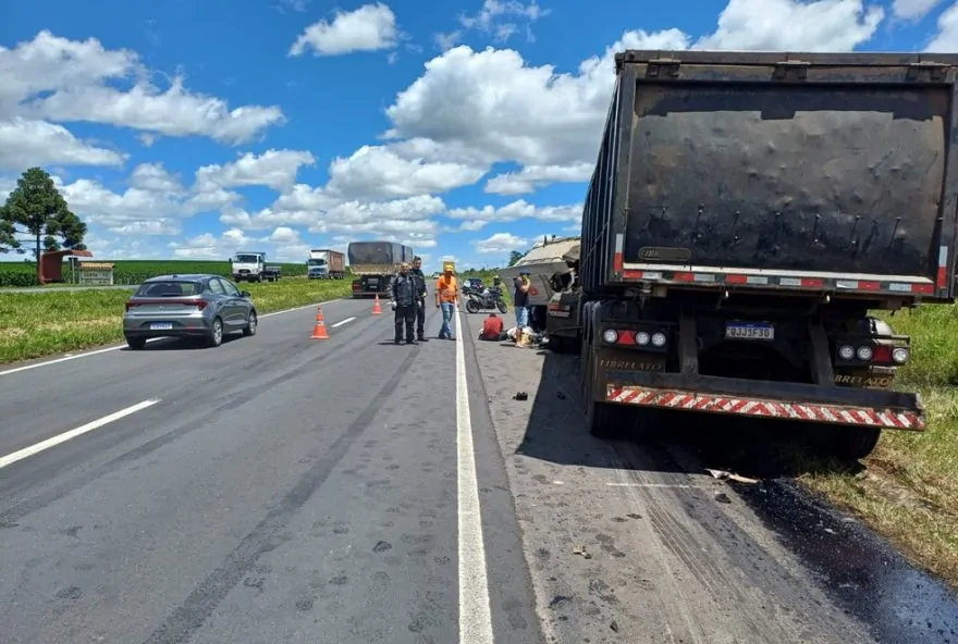 Segundo a PRF, um caminhão colidiu na traseira do outro e um dos veículos acabou atingindo um colaborador de empresa terceirizada que estava realizando a manutenção no asfalto.
