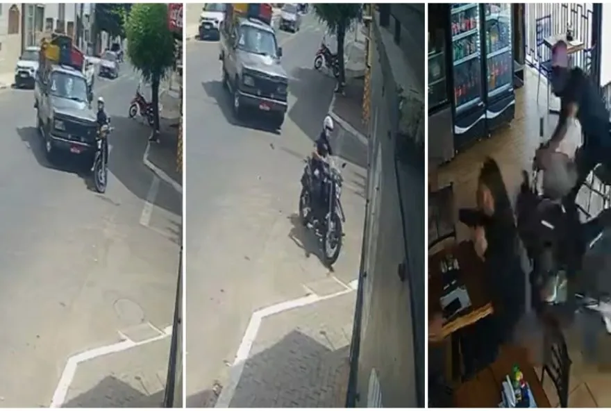 Após se chocarem, o motociclista acaba deslizando para dentro da padaria, onde dois clientes estavam sendo atendidos por uma funcionária. As câmeras internas do estabelecimento captaram o momento exato em que a moto invade o espaço e para após se chocar contra os móveis.