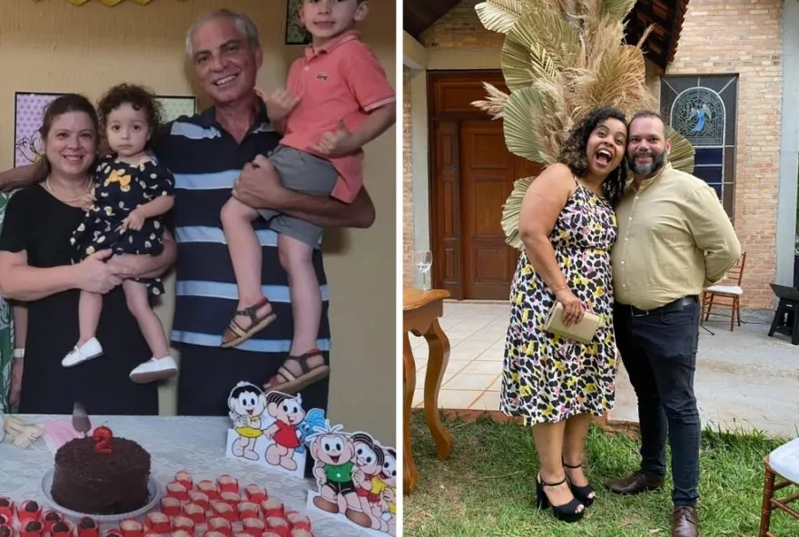 À esquerda, Karin Elisabeth e Allan Cláudio com a filha Vitória Sofia. À direita Thalita Matos e seu marido, que ainda vivem à espera — Foto: Arquivo Pessoal