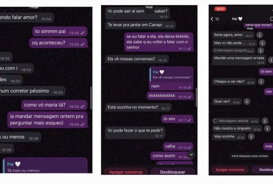 A adolescente de 16 anos contou à polícia que não mantinha relação próxima com o genitor, que a reconheceu recentemente e pagava pensão. Capturas de tela mostram mensagens que o suspeito teria enviado para a filha.