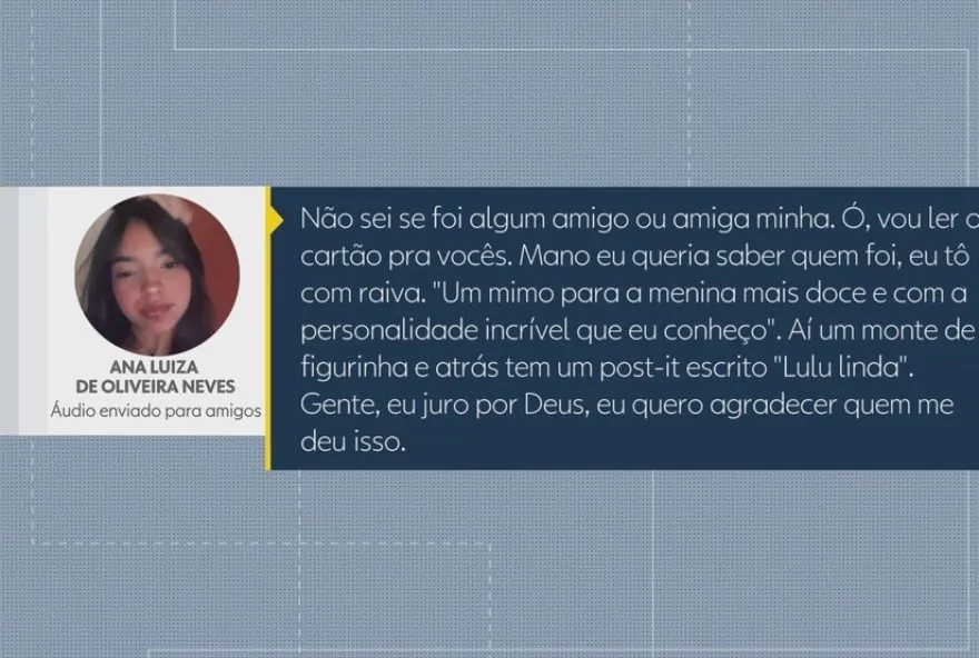 Ana Luiza de Oliveira Neves, a adolescente de 17 anos que morreu após passar mal com um bolo enviado de forma anônima em casa, em Itapecerica da Serra, na Grande SP, chegou a enviar um áudio para um grupo de amigos para descobrir quem tinha mandado o produto, no último sábado (31).