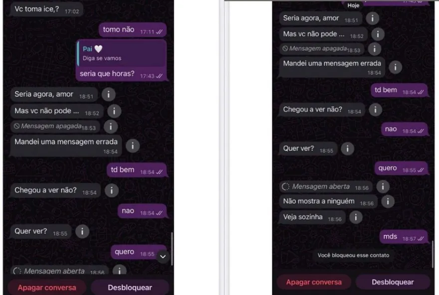 Os prints da conversa mostram que, nas mensagens, o homem admite que enviou uma mensagem errada e logo depois pergunta “chegou a ver não? Quer ver?”. Ele reenvia o conteúdo e pede que ela veja sozinha e que não mostre a ninguém (veja nas imagens acima).