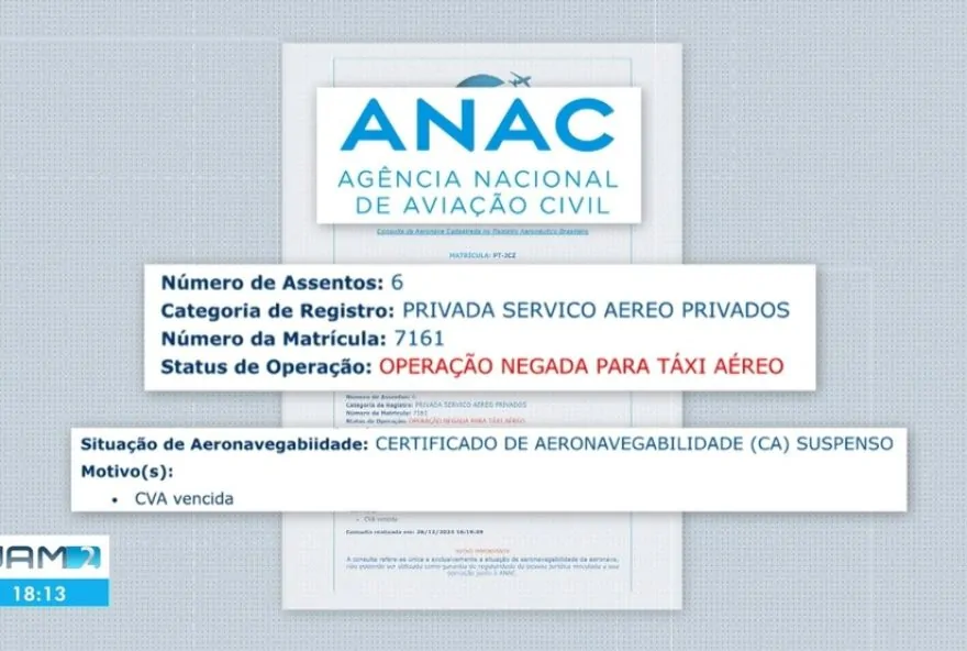 No sistema da Anac consta que a aeronave estava com o Certificado de Verificação de Aeronavegabilidade vencido, indicando que o avião não poderia estar voando.