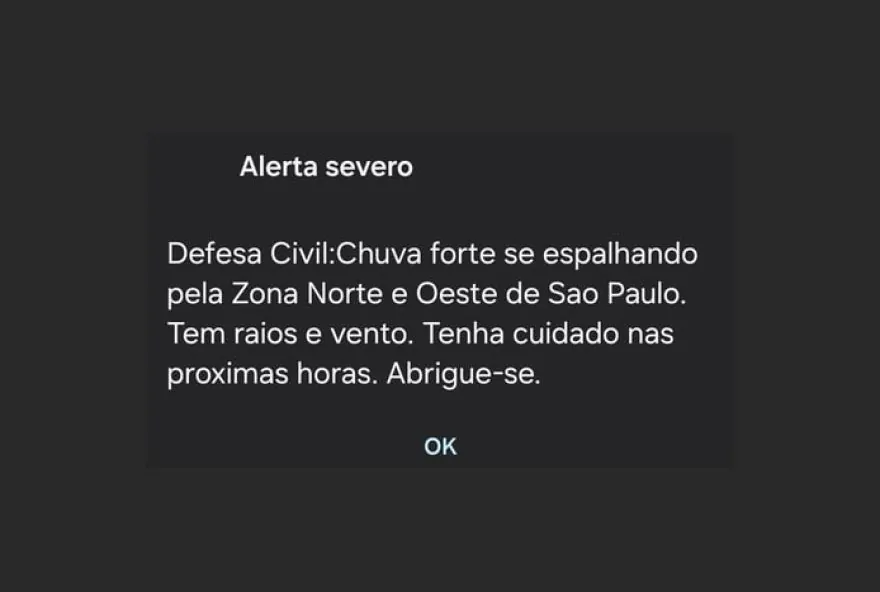 Segundo o órgão, há registro de raios e vento. “Tenha cuidado nas próximas horas. Abrigue-se”, notificou à população.