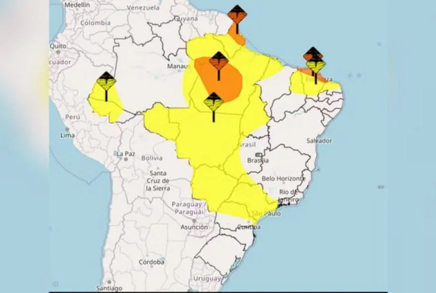 Os de coloração amarela, de “perigo potencial”, afetam Acre, Amapá, Amazonas, Ceará, Goiás, Maranhão, Mato Grosso, Mato Grosso do Sul, Minas Gerais, Pará, Paraíba, Paraná, Piauí, Rio Grande do Norte, Rondônia, São Paulo e Tocantins. Nestes locais, o órgão prevê chuvas entre 20 e 30 mm/h e os ventos pode chegar a 60 km/h. O alerta de maior intensidade encobre parte do Norte e Nordeste do Brasil. Nestas regiões, apenas Amapá, Amazonas, Ceará, Pará, Piauí e Rio Grande do Norte serão afetados pelas três manchas laranja. Elas avisam que haverá chuva de até 100 mm/dia, ventos intensos entre 60 e 100 km/h. Além disso, tem risco de corte de energia elétrica, queda de galhos de árvores, alagamentos e de descargas elétricas.