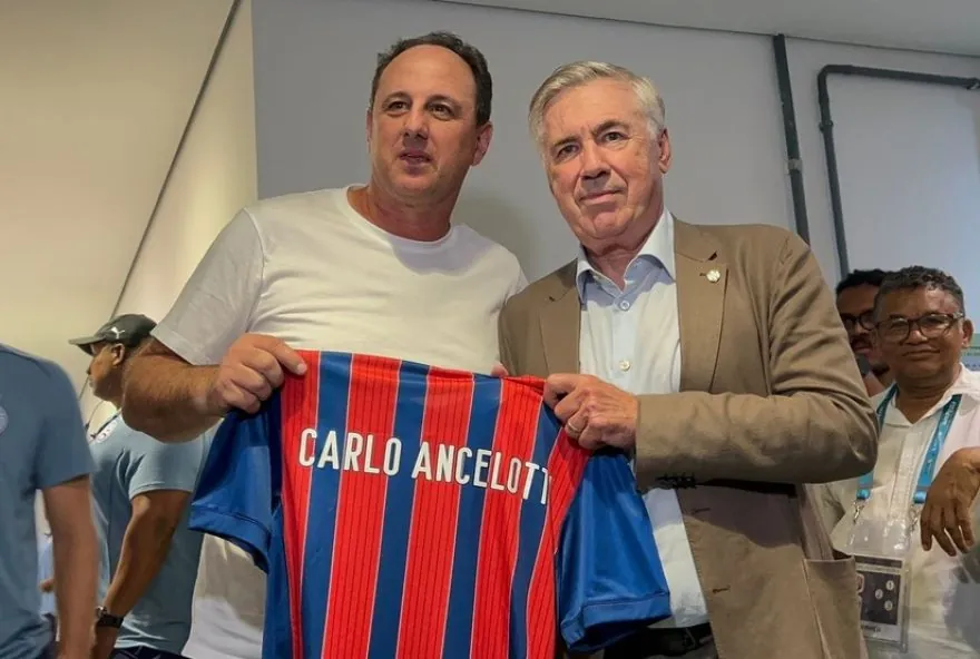 O treinador da Seleção Brasileira, Carlo Ancelotti, marcou presença na Casa de Apostas Arena Fonte Nova para acompanhar de perto a partida entre Bahia e Santos, que aconteceu no último domingo. Durante o evento, Ancelotti teve a oportunidade de receber das mãos de Rogério Ceni uma camisa do Bahia, momento que foi registrado em fotos.