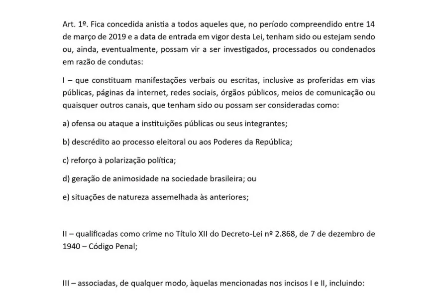 O documento em questão, sob a lei nº 2.868 de 2021, visa absolver aqueles que possam ser investigados por tentativas de golpe de estado. Essa versão específica de anistia é apoiada pela ala mais radical dos seguidores de Bolsonaro, levantando questões e gerando polêmica em relação aos limites e consequências desse tipo de projeto.