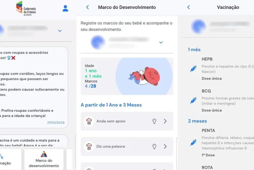 Lançado pela prefeitura de Recife, o aplicativo Caderneta da Criança está disponível dentro do Conecta Recife. Com mais de 108 mil crianças de até 10 anos cadastradas na plataforma, os pais e responsáveis podem acessar informações essenciais sobre os marcos de desenvolvimento, como engatinhar, reflexos e estímulos esperados para cada fase da vida da criança, além de pílulas de conhecimento.