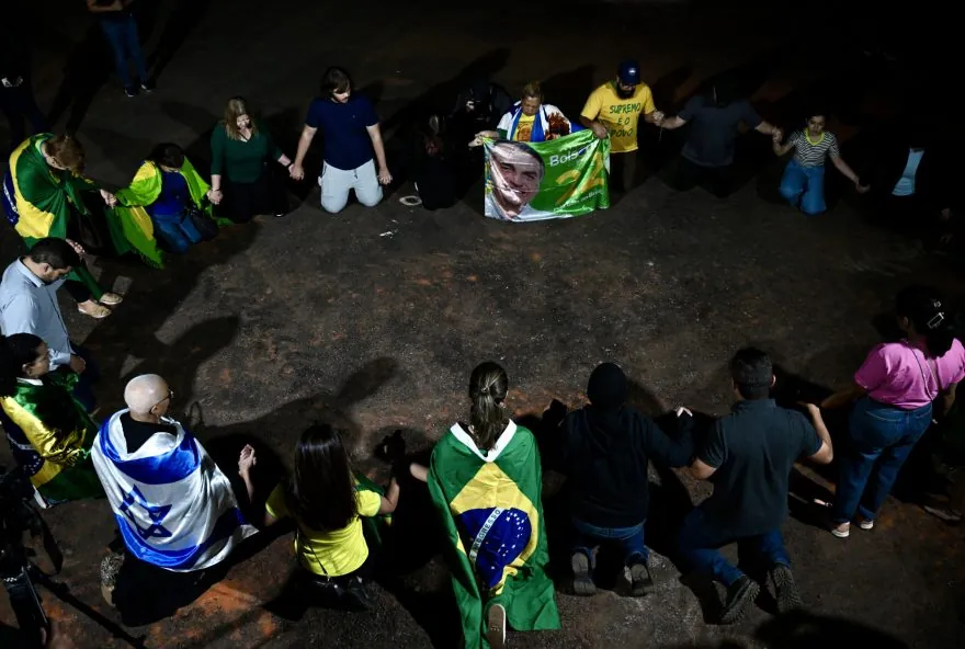 Supporters of former Brazilian President Jair Bolsonaro pray during a vigil near the former president's home in Brasilia on September 1, 2025. The former army captain is accused of conspiring to stay in power after his electoral defeat to leftist President Luiz Inacio Lula da Silva in 2022. A conviction in court -- with a verdict due any time from September 2-- could send the 70-year-old to prison, perhaps for the rest of his life. (Photo by Evaristo Sa / AFP)