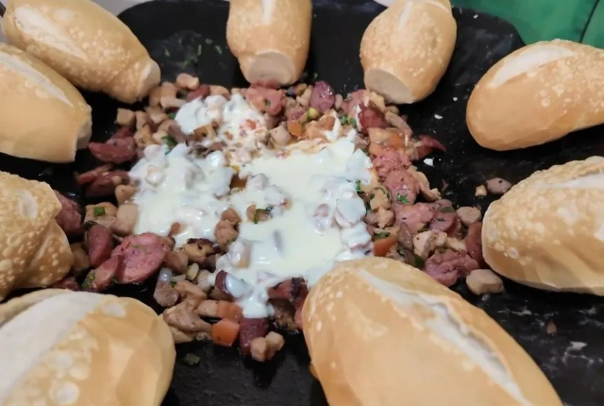 Os ingredientes necessários para a receita são: 10 pães, 200g de sobrecoxa, 200g de acém em tiras, 200g de pernil, 200g de panceta, 100g de bacon, 100g de linguiça calabresa, 2 linguiças toscanas, 1 tomate, 1 cebola, rúcula, 100g de muçarela, 1 requeijão, noz-moscada, cheiro verde e sal, todos a gosto.