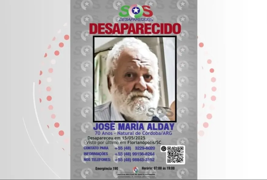 José María Alday estava visitando um amigo no bairro Pântano do Sul quando desapareceu. Os bombeiros estão em busca do argentino, que saiu para um passeio e não retornou, desde a última quinta-feira (15). As autoridades estão mobilizadas e realizando buscas na região da Lagoinha do Leste, em Florianópolis.