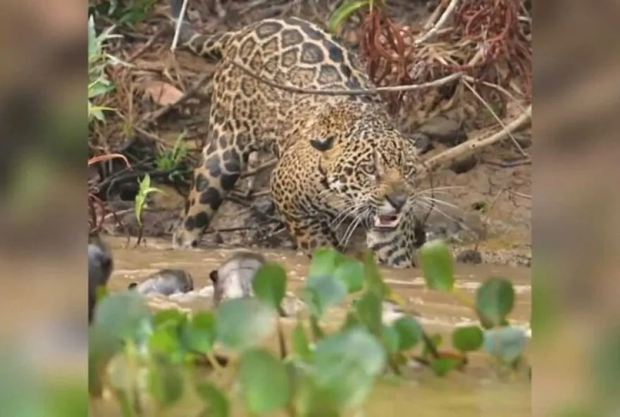 Ariranhas encaram onça-pintada e a colocam para correr no Pantanal