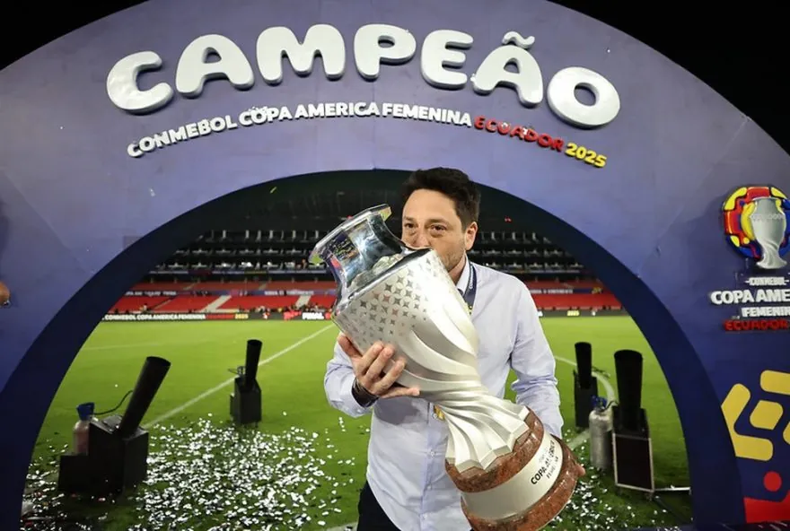 DE técnico de 44 anos treina a seleção brasileira feminina desde 2023. No último sábado, ele liderou a equipe na conquista da Copa América sobre a Colômbia. As equipes empataram em 4 a 4, e o Brasil ficou com o título nos pênaltis.