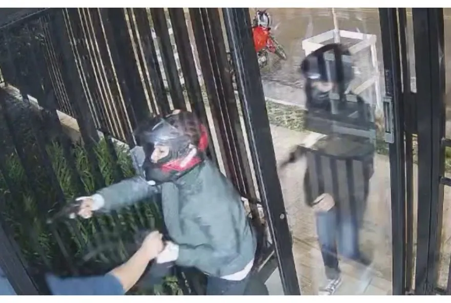 Quando os dois têm a entrada liberada no prédio, são surpreendidos por um dos assaltantes, que salta da moto. Com uma arma na mão, o homem chuta o portão e derruba uma das vítimas.