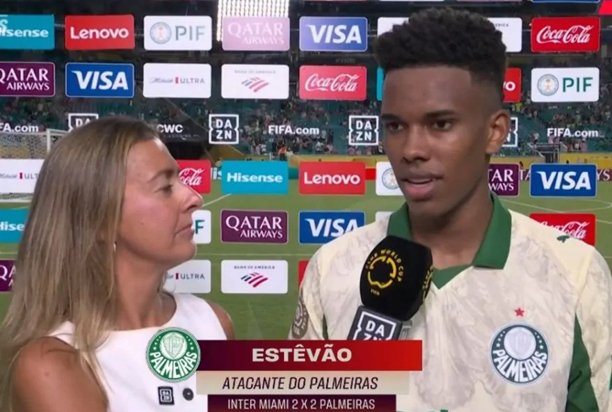 Os deuses do futebol reservaram um confronto entre Botafogo e Palmeiras nas oitavas de final da Copa do Mundo de Clubes. Após o empate em 2 a 2 com o Inter Miami, o atacante Estêvão projetou o confronto e elogiou o rival.