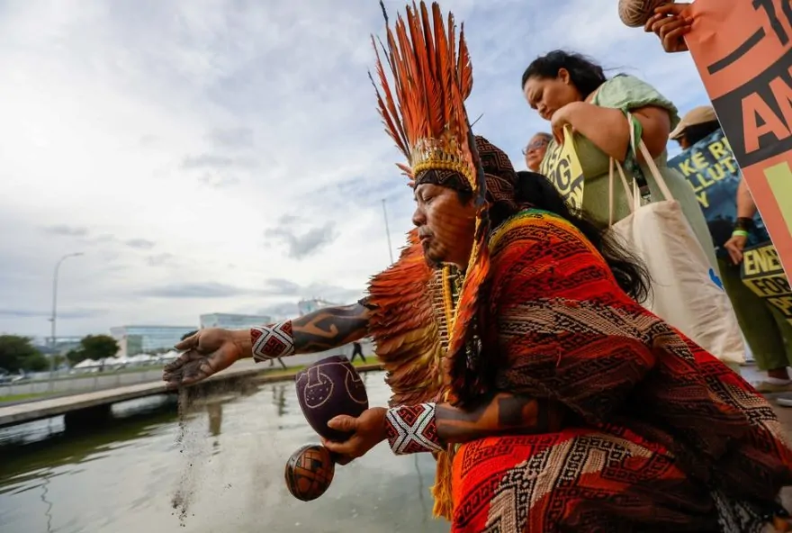 Durante a manifestação, o Cacique Ninawa, da liderança indígena do povo huni kui, fez uma ação simbólica ao jogar cinzas da região amazônica no espelho d’água do Palácio do Itamaraty. Ele destacou a falta de representatividade dos povos originários nas negociações da COP30. O cacique ressaltou a importância de registrar a marca desses incêndios no Ministério de Relações Exteriores, que é responsável pelas negociações e investimentos nas regiões dos biomas brasileiros.