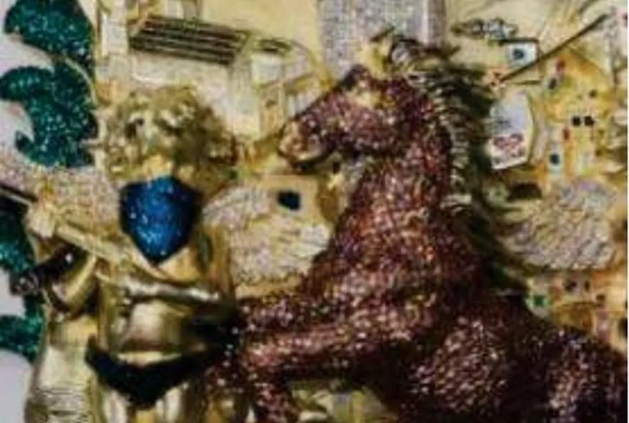 No centro, aparecem a figura de um anjo dourado com escudo azul e um cavalo marrom em movimento, ambos também cobertos por pedras brilhantes.