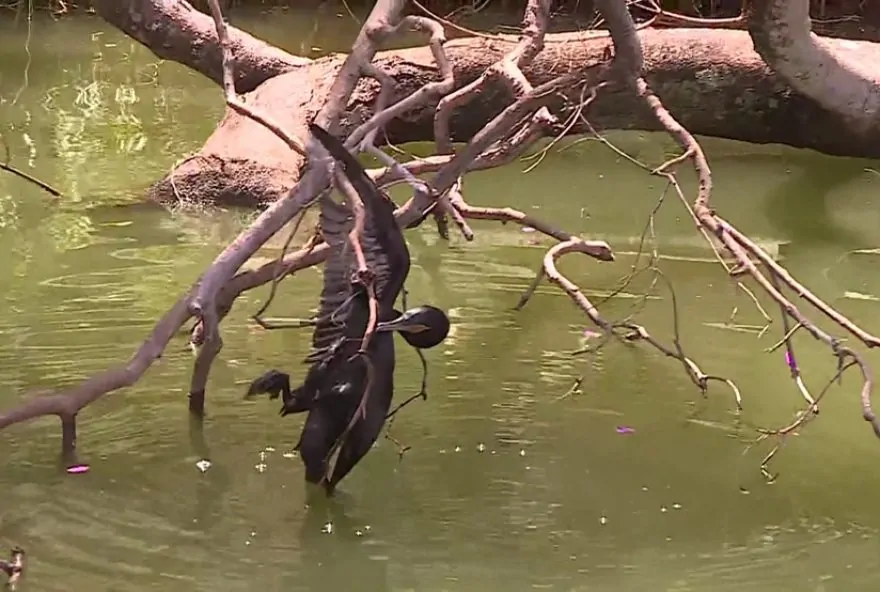 Ave biguá ferida por anzol é resgatada presa em linhas de pesca na Lagoa da Pampulha; VÍDEO