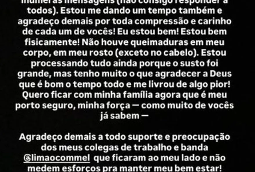 Nathy Souza explicou que ficou bastante assustada e que o fogo atingiu apenas o cabelo, não deixando queimaduras no seu corpo. A backing vocal Nathy Souza divulgou, nesta segunda-feira (28), em suas redes sociais, uma nota de esclarecimento. Ela disse que ‘ainda estava processando tudo, porque o susto foi grande’. Na noite do domingo (27), o fogo atingiu seu cabelo durante um show da banda Limão com Mel, no Festival Pernambuco Meu País, em Salgueiro, no Sertão.