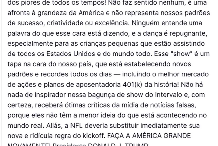 “Absolutamente terrível, um dos piores de todos os tempos! Não faz sentido nenhum, é uma afronta à grandeza da América e não representa nossos padrões de sucesso, criatividade ou excelência”, disse na postagem. “Ninguém entende uma palavra do que esse cara está dizendo, e a dança é repugnante”, continuou. “Esse “show” é um tapa na cara do nosso país, que está estabelecendo novos padrões e recordes todos os dias”.