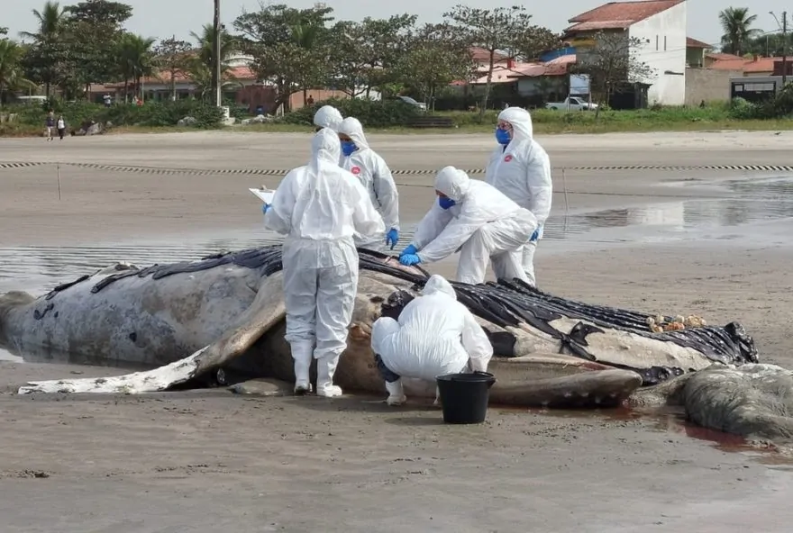 Baleia-jubarte é encontrada morta atolada em praia de Itanhaém