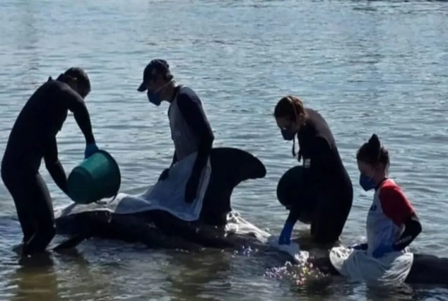 Baleia-piloto de mais de 4 metros encalha em praia de Santa Catarina