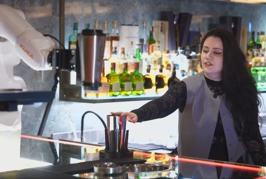 Quem comanda o robô e também o bar do espaço, que é praticamente feminino, é a bartender Jocassia Coelho. Foi ela quem criou a carta de drinks, que tem 14 tempos, e segue a história da criação das bebidas alcoólicas, começando pelos coquetéis feitos a base de vinho.