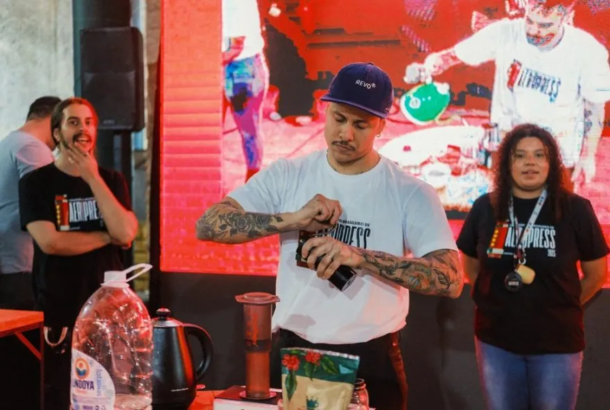 Caio contou que entrou no ‘mundo do café’ há cinco anos, após o incentivo de um ex-patrão. No mês passado, o barista da REVO Manufacture resolveu se aventurar novamente, fazendo a inscrição no Campeonato Brasileiro de Aeropress, que é método manual que utiliza pressão de ar para extrair a bebida, resultando em um café encorpado e aromático.