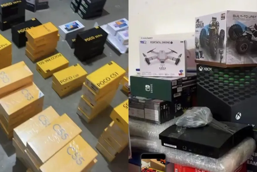 Entre os produtos à venda estão iPhones, celulares, caixas de som, fones de ouvido bluetooth, perfumes importados, eletroeletrônicos, brinquedos, malas de viagem, roupas e muitos outros artigos.
