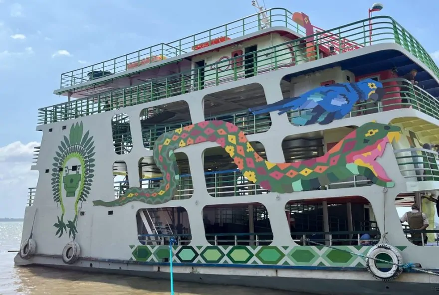 A embarcação que dá vida à Bienal das Amazônias Sobre as Águas foi projetada pelo artista boliviano Freddy Mamani a partir de uma ideia em 2021. Pedreiro e arquiteto autodidata, Mamany se notabilizou ao criar uma nova arquitetura andina.